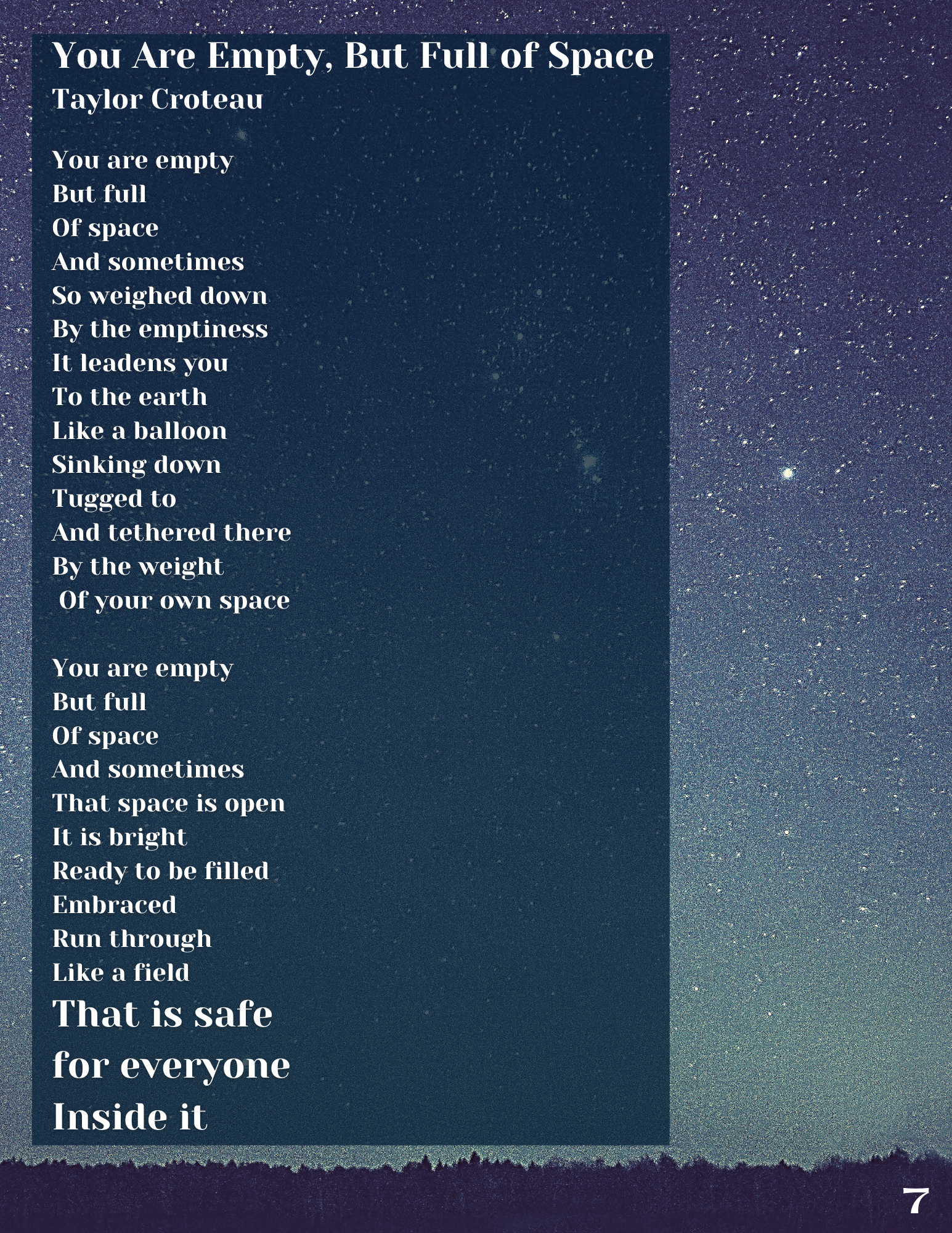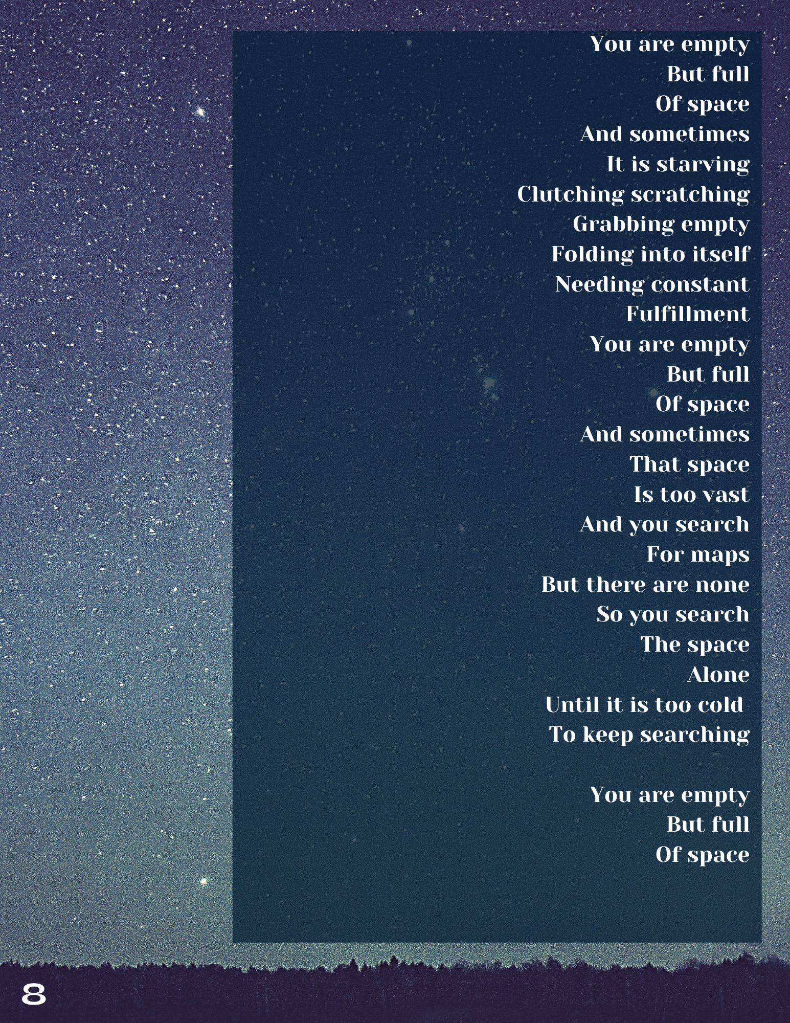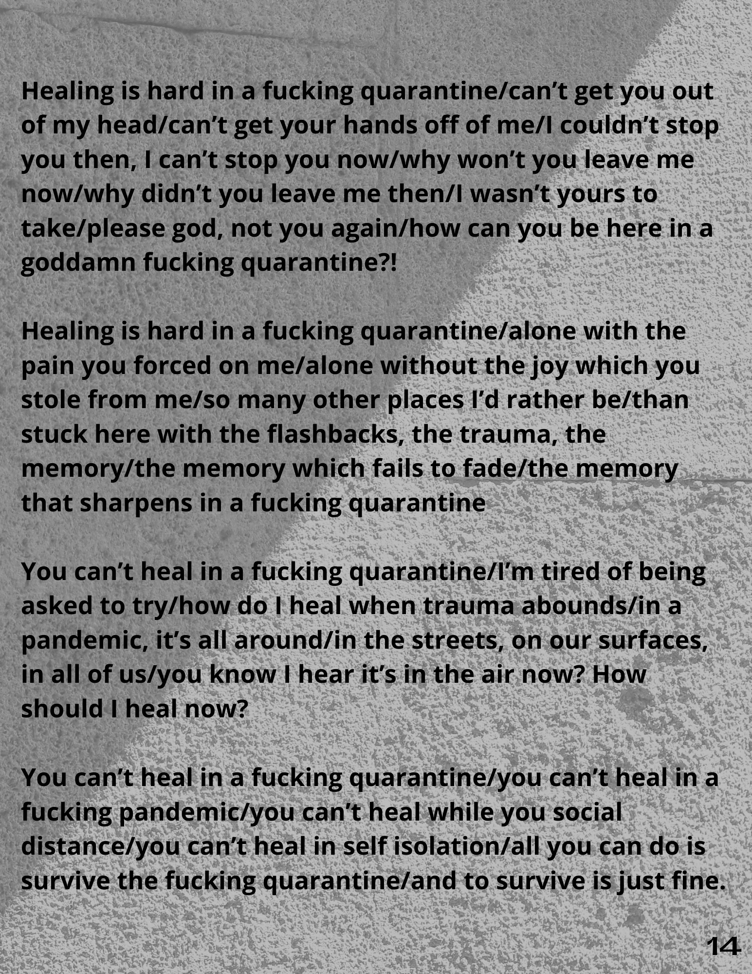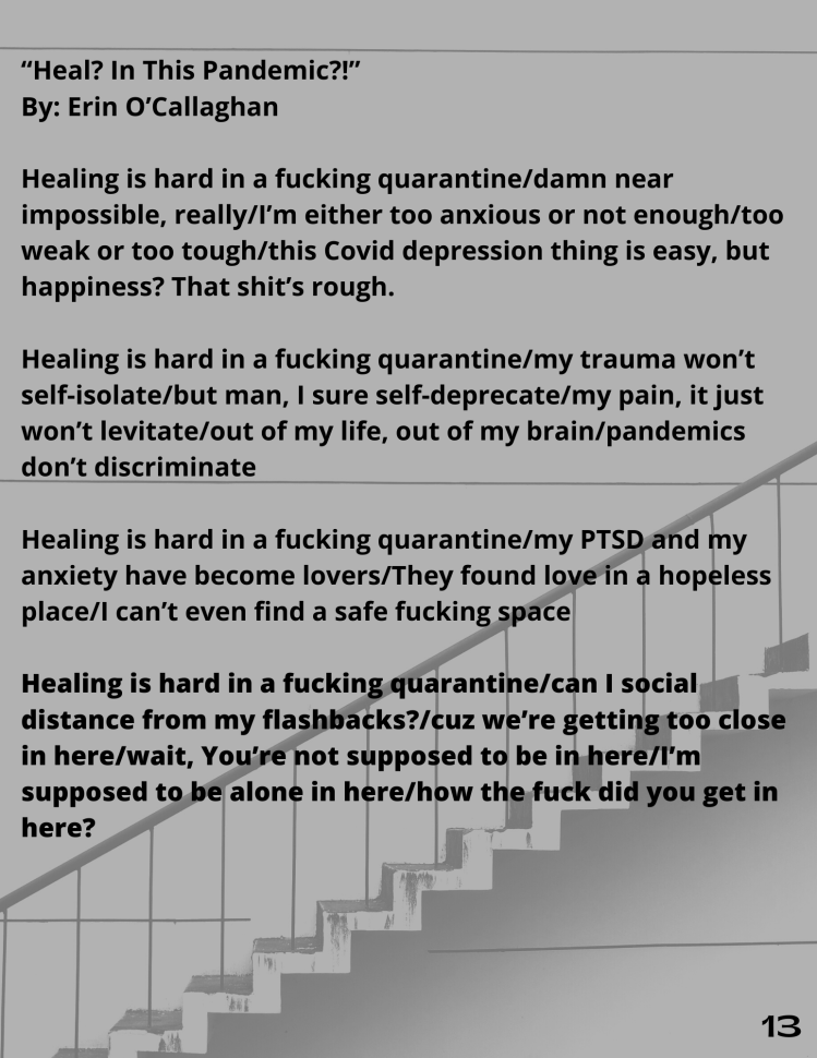 Image description: black and white image of cluster of white and gray origami cranes against a black background, with sky blue text that reads “Surviving the Mic Surviving Social Distance” in top left corner and “Issue 1 December 2020” in bottom left corner. Surviving the Mic logo in bottom right corner which is a dark blue circle with turquoise text that reads “Surviving the Mic” and hot pink text in the middle of the circle that reads “survivingthemic.orgImage description: table of contents in black text against a cream-colored background that with dark brown horizontal lines, in the style of wide-ruled notebook paperImage description: black text of a letter from the editor against an orange-red background that’s in ombre style flowing from lighter orange-red at the top to darker orange-red at the bottom.Image description: image of a ceramic gray frog holding a book and underneath a toadstool in the same color and material, sitting in green grass. There are two other books leaning against the frog and toadstool. The book on the left is a light red color with gold lettering on the front that says “Diary” and a dark gray metal lock. The book on the right is a faded navy blue that says “Poetry” in gold lettering. There is right text in the middle bottom of the page that says “Part 1” in white text.Image description: Background image is a painted brick wall which is pale brown for most of the page with a shadow to the top. Four fifths of the way down the page is a horizontal black stripe and the lower part of the wall is dark teal. The text is black over the light part of the wall and turns white over the dark part of the wall. Text is justified left. There is a page number ‘1’ in black in the bottom left corner.Image description: Background image is a painted brick wall which is pale brown for most of the page with a shadow to the top. Four fifths of the way down the page is a horizontal black stripe and the lower part of the wall is dark teal. The text is black over the light part of the wall and turns white over the dark part of the wall. Text is justified left. There is a page number ‘2’ in white in the bottom right corner.Image description: The background image is a photograph of a tree lined path with fall leaves along the edges and the sun is low and visible through the trees. The image is faded in warm yellow tones. Overlaid text is in black cursive font and centered on the page. There is a page number ‘3’ in black in the bottom left corner.The background image is a photograph of a tree lined path with fall leaves along the edges and the sun is low and visible through the trees. The image is faded in warm yellow tones. Overlaid text is in black cursive font and centered on the page. There is a page number ‘4’ in black in the bottom right corner.Image description: The background image is of a single, snow covered tree branch in black and white, with light gray background. The overlaid text is black, with some lines in cursive font and others in a typewriter font, all justified left. There is a page number ‘5’ in black in the bottom right corner.Image description: The background image is of a pale yellow wall with a shadow cast at a 45 degree angle across two thirds of the page. There is a beam of sunshine under the shadow at the same angle. The black text is in a serif font and presented as prose. There is a page number ‘6’ in black in the bottom right corner.Image description: The background image is a starry night sky fading from midnight blue at the top to grey-blue at the bottom, where there is the silhouette of a horizon. The text is white in a serif font and is justified left. The text is in a dark blue rectangle with some transparency so the stars from the background show through. There is a page number ‘7’ in white in the bottom right corner.Image description: The background image is a starry night sky fading from midnight blue at the top to grey-blue at the bottom, where there is the silhouette of a horizon. The text is white in a serif font and is justified right. The text is in a dark blue rectangle with some transparency so the stars from the background show through. There is a page number ‘8’ in white in the bottom left corner.Image description: Black and white photograph of several origami cranes of different shapes and sizes, folded from white paper. The cranes are arranged in a crown on a black surface, in front of a light gray wall. The edge of the black surface is across the bottom of the photograph. The caption is is white serif text to the bottom left.Image description: The bold white text is justified left. The background image is a faded zoom in on the orange and yellow heart of an open fire. Sparks fly above the fire against a flat black backdrop. There is a page number ’10’ in white in the bottom right corner.