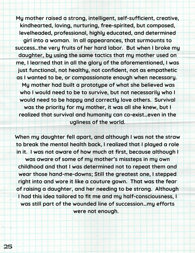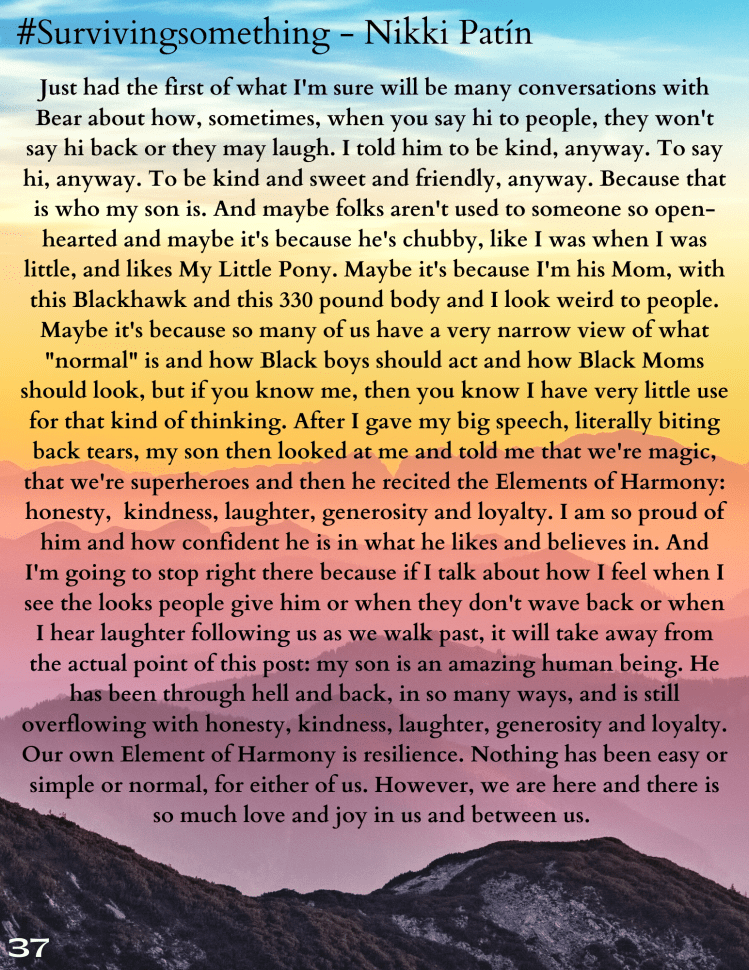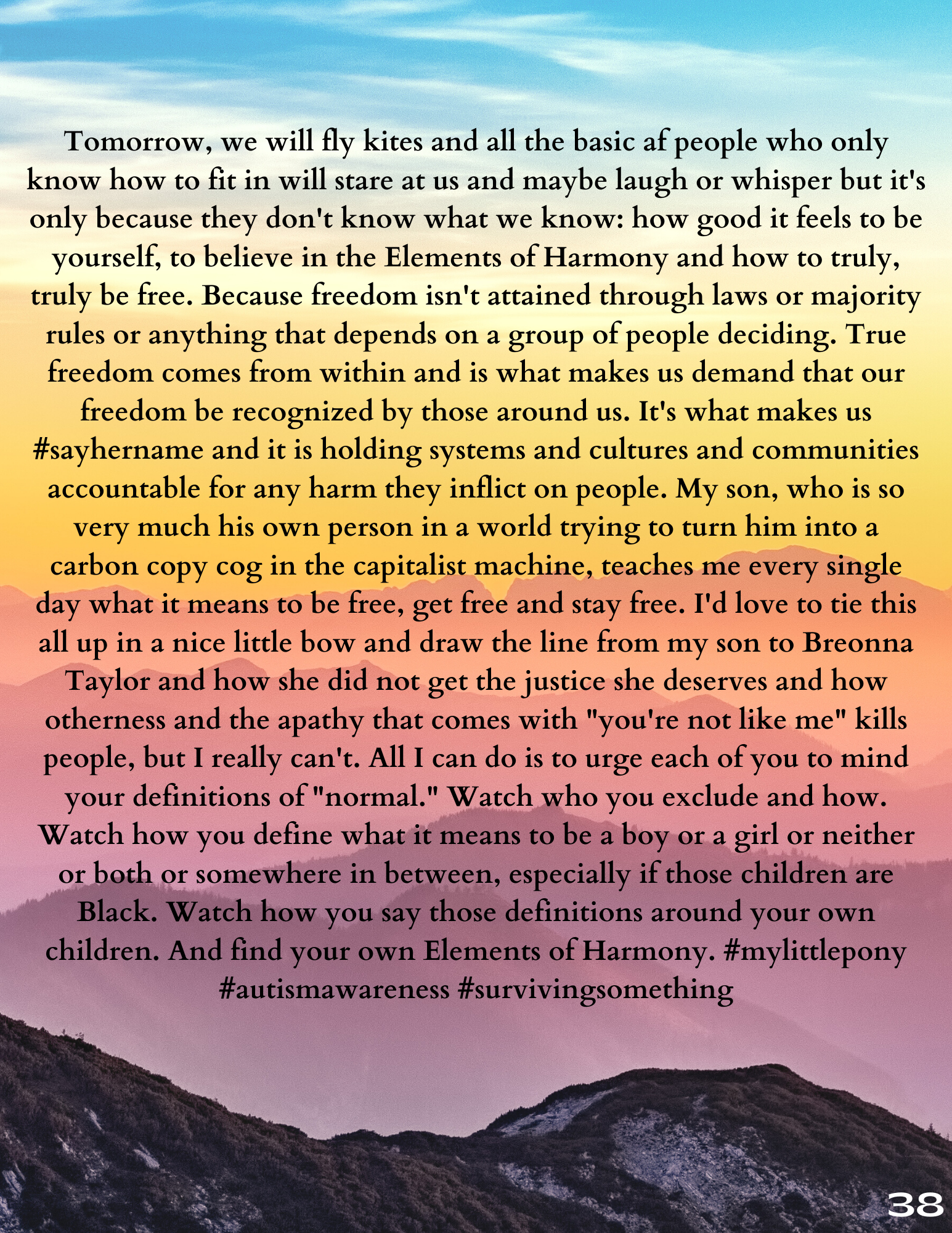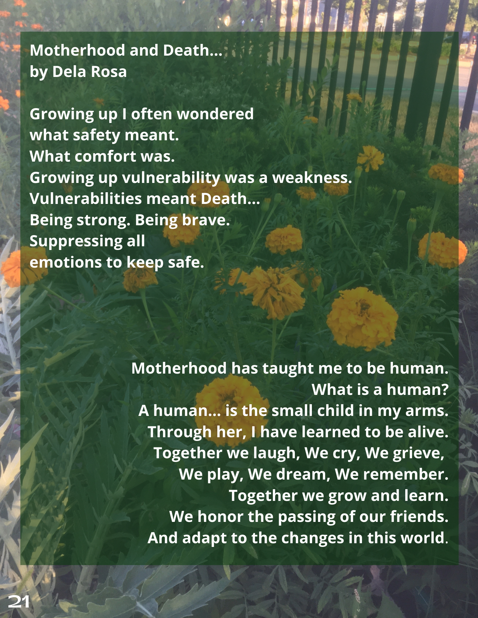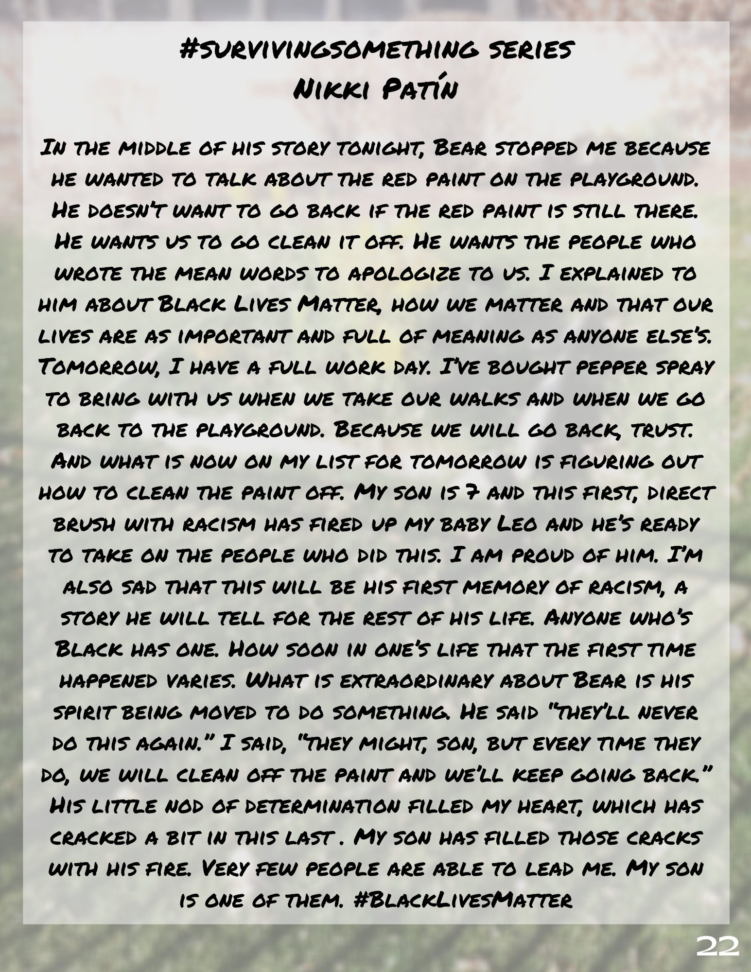 Image description: black and white image of cluster of white and gray origami cranes against a black background, with sky blue text that reads “Surviving the Mic Surviving Social Distance” in top left corner and “Issue 1 December 2020” in bottom left corner. Surviving the Mic logo in bottom right corner which is a dark blue circle with turquoise text that reads “Surviving the Mic” and hot pink text in the middle of the circle that reads “survivingthemic.orgImage description: table of contents in black text against a cream-colored background that with dark brown horizontal lines, in the style of wide-ruled notebook paperImage description: black text of a letter from the editor against an orange-red background that’s in ombre style flowing from lighter orange-red at the top to darker orange-red at the bottom.Image description: image of a ceramic gray frog holding a book and underneath a toadstool in the same color and material, sitting in green grass. There are two other books leaning against the frog and toadstool. The book on the left is a light red color with gold lettering on the front that says “Diary” and a dark gray metal lock. The book on the right is a faded navy blue that says “Poetry” in gold lettering. There is right text in the middle bottom of the page that says “Part 1” in white text.Image description: Background image is a painted brick wall which is pale brown for most of the page with a shadow to the top. Four fifths of the way down the page is a horizontal black stripe and the lower part of the wall is dark teal. The text is black over the light part of the wall and turns white over the dark part of the wall. Text is justified left. There is a page number ‘1’ in black in the bottom left corner.Image description: Background image is a painted brick wall which is pale brown for most of the page with a shadow to the top. Four fifths of the way down the page is a horizontal black stripe and the lower part of the wall is dark teal. The text is black over the light part of the wall and turns white over the dark part of the wall. Text is justified left. There is a page number ‘2’ in white in the bottom right corner.Image description: The background image is a photograph of a tree lined path with fall leaves along the edges and the sun is low and visible through the trees. The image is faded in warm yellow tones. Overlaid text is in black cursive font and centered on the page. There is a page number ‘3’ in black in the bottom left corner.The background image is a photograph of a tree lined path with fall leaves along the edges and the sun is low and visible through the trees. The image is faded in warm yellow tones. Overlaid text is in black cursive font and centered on the page. There is a page number ‘4’ in black in the bottom right corner.Image description: The background image is of a single, snow covered tree branch in black and white, with light gray background. The overlaid text is black, with some lines in cursive font and others in a typewriter font, all justified left. There is a page number ‘5’ in black in the bottom right corner.Image description: The background image is of a pale yellow wall with a shadow cast at a 45 degree angle across two thirds of the page. There is a beam of sunshine under the shadow at the same angle. The black text is in a serif font and presented as prose. There is a page number ‘6’ in black in the bottom right corner.Image description: The background image is a starry night sky fading from midnight blue at the top to grey-blue at the bottom, where there is the silhouette of a horizon. The text is white in a serif font and is justified left. The text is in a dark blue rectangle with some transparency so the stars from the background show through. There is a page number ‘7’ in white in the bottom right corner.Image description: The background image is a starry night sky fading from midnight blue at the top to grey-blue at the bottom, where there is the silhouette of a horizon. The text is white in a serif font and is justified right. The text is in a dark blue rectangle with some transparency so the stars from the background show through. There is a page number ‘8’ in white in the bottom left corner.Image description: Black and white photograph of several origami cranes of different shapes and sizes, folded from white paper. The cranes are arranged in a crown on a black surface, in front of a light gray wall. The edge of the black surface is across the bottom of the photograph. The caption is is white serif text to the bottom left.Image description: The bold white text is justified left. The background image is a faded zoom in on the orange and yellow heart of an open fire. Sparks fly above the fire against a flat black backdrop. There is a page number ’10’ in white in the bottom right corner.