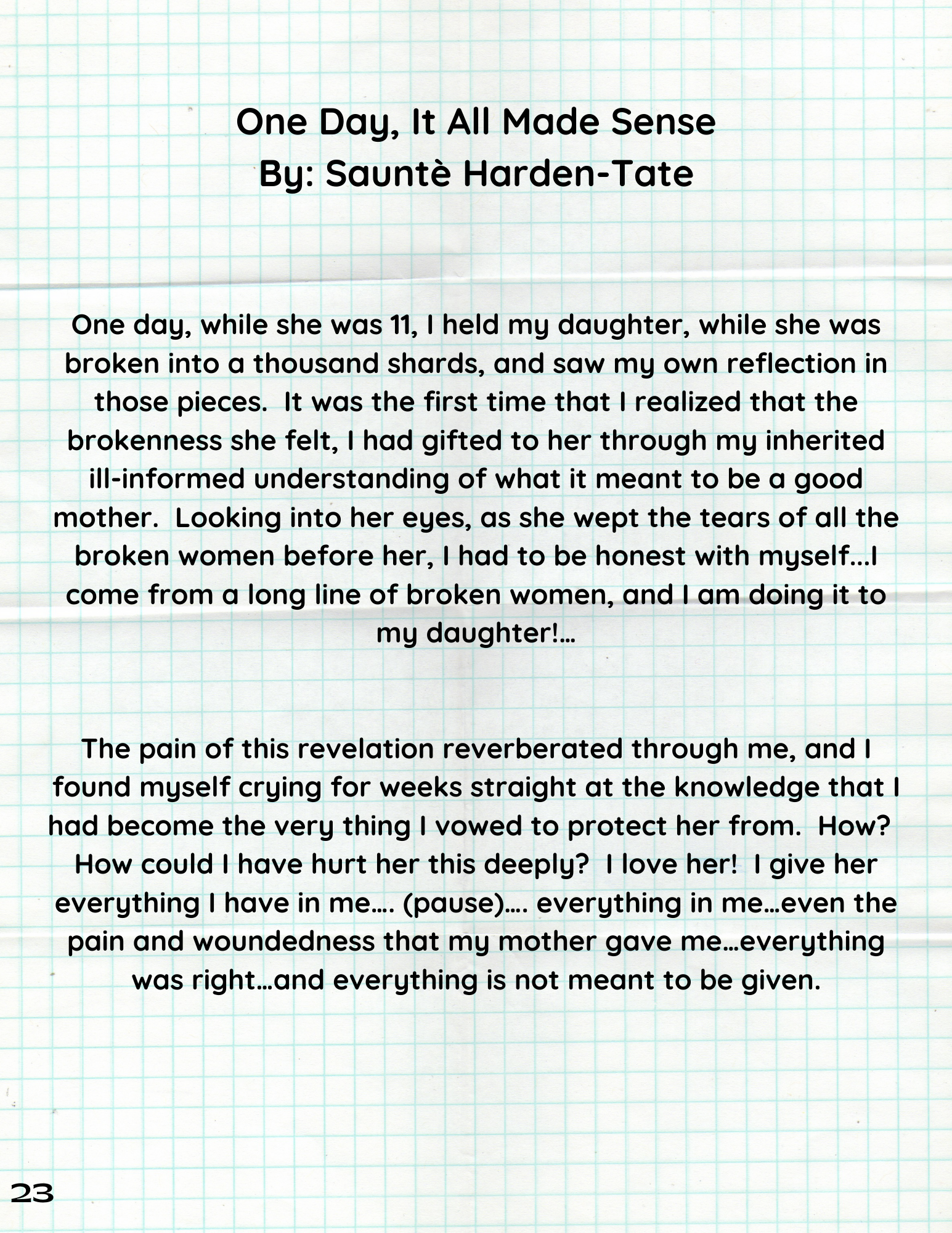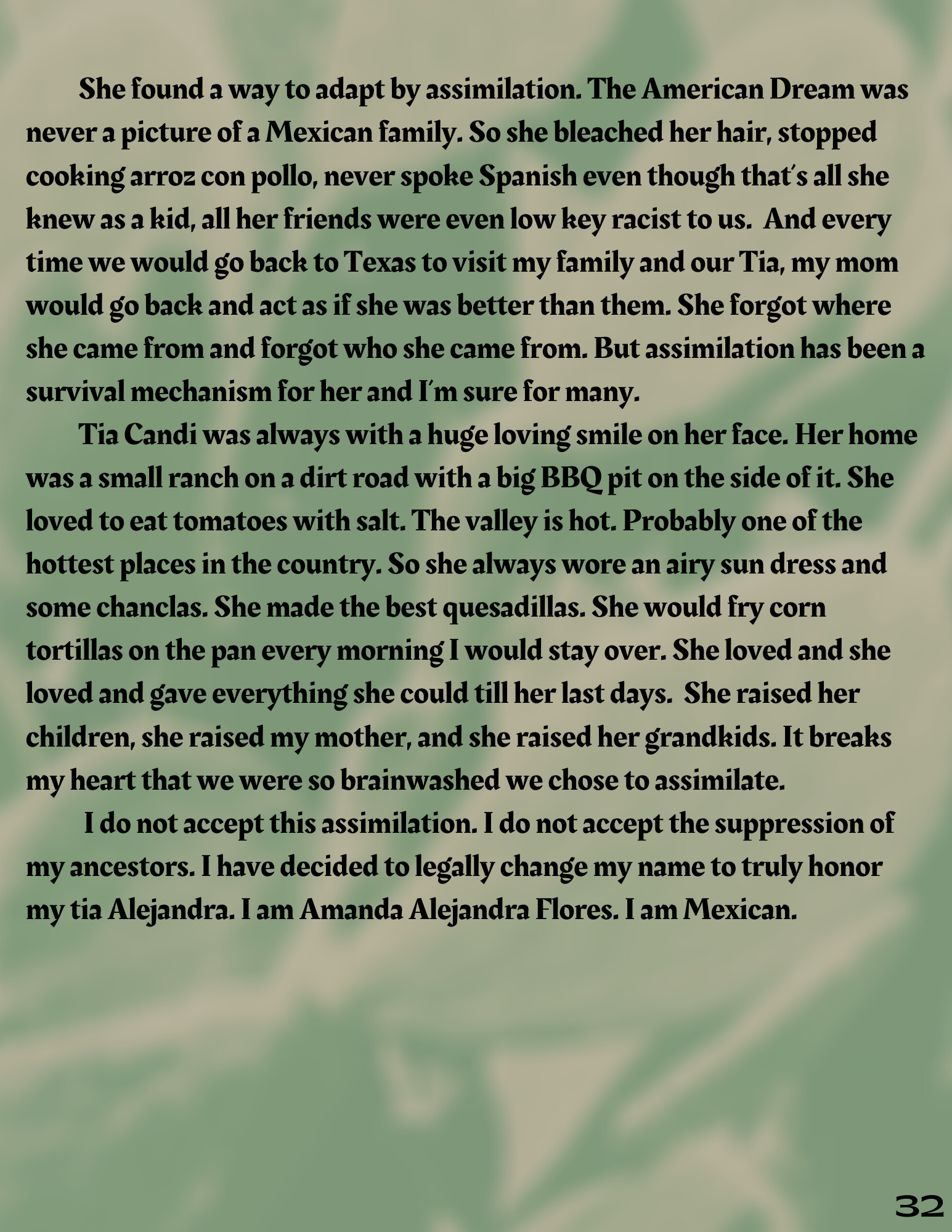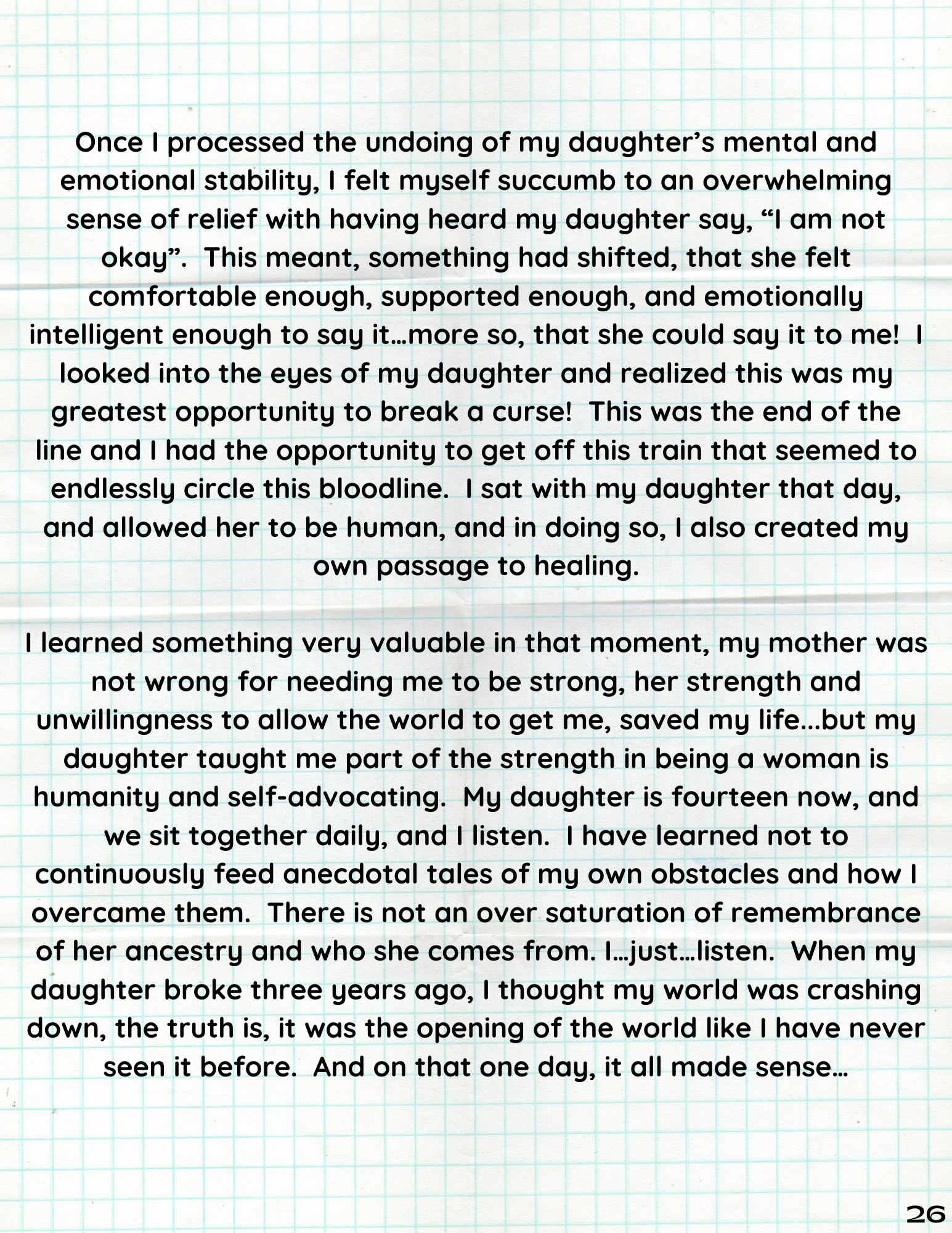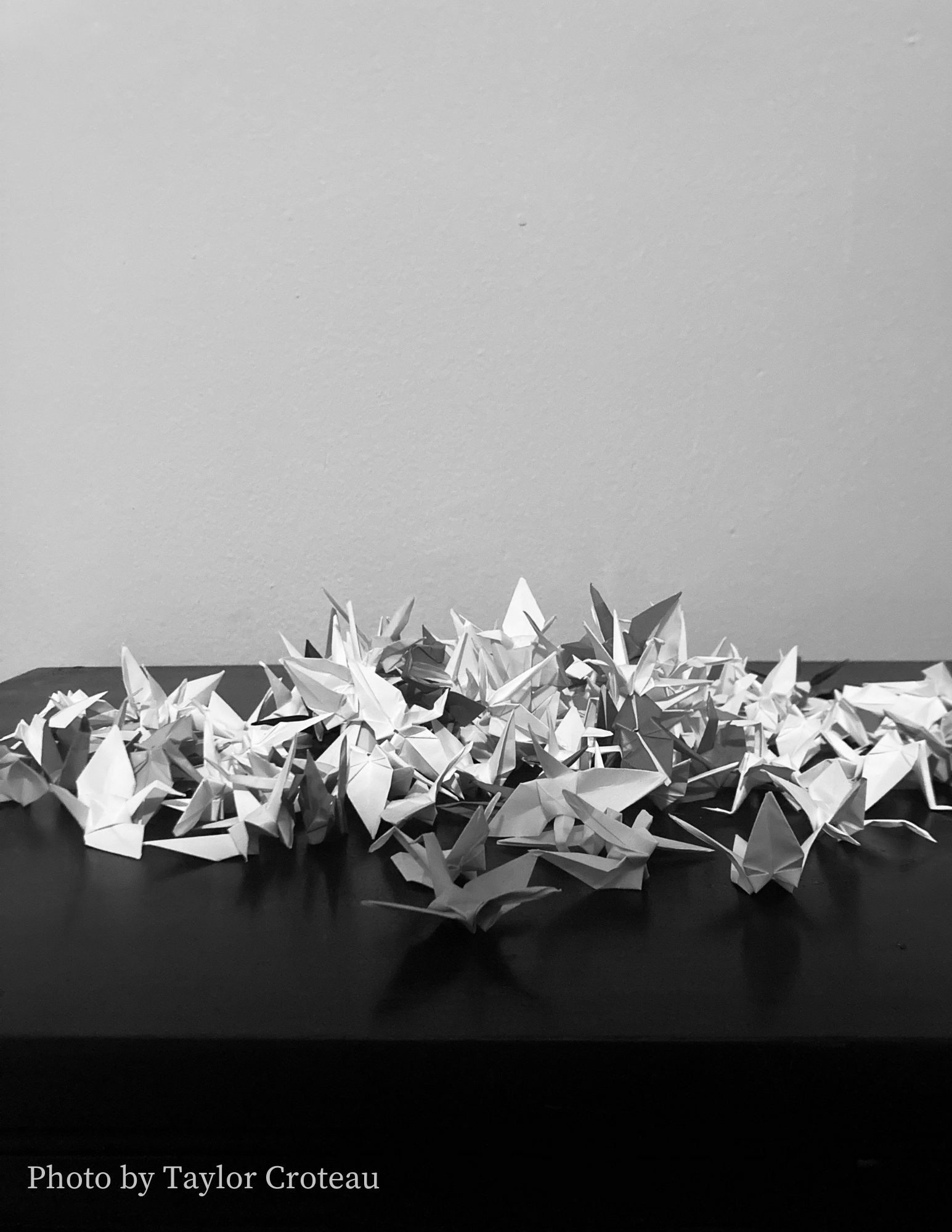 Image description: black and white image of cluster of white and gray origami cranes against a black background, with sky blue text that reads “Surviving the Mic Surviving Social Distance” in top left corner and “Issue 1 December 2020” in bottom left corner. Surviving the Mic logo in bottom right corner which is a dark blue circle with turquoise text that reads “Surviving the Mic” and hot pink text in the middle of the circle that reads “survivingthemic.orgImage description: table of contents in black text against a cream-colored background that with dark brown horizontal lines, in the style of wide-ruled notebook paperImage description: black text of a letter from the editor against an orange-red background that’s in ombre style flowing from lighter orange-red at the top to darker orange-red at the bottom.Image description: image of a ceramic gray frog holding a book and underneath a toadstool in the same color and material, sitting in green grass. There are two other books leaning against the frog and toadstool. The book on the left is a light red color with gold lettering on the front that says “Diary” and a dark gray metal lock. The book on the right is a faded navy blue that says “Poetry” in gold lettering. There is right text in the middle bottom of the page that says “Part 1” in white text.Image description: Background image is a painted brick wall which is pale brown for most of the page with a shadow to the top. Four fifths of the way down the page is a horizontal black stripe and the lower part of the wall is dark teal. The text is black over the light part of the wall and turns white over the dark part of the wall. Text is justified left. There is a page number ‘1’ in black in the bottom left corner.Image description: Background image is a painted brick wall which is pale brown for most of the page with a shadow to the top. Four fifths of the way down the page is a horizontal black stripe and the lower part of the wall is dark teal. The text is black over the light part of the wall and turns white over the dark part of the wall. Text is justified left. There is a page number ‘2’ in white in the bottom right corner.Image description: The background image is a photograph of a tree lined path with fall leaves along the edges and the sun is low and visible through the trees. The image is faded in warm yellow tones. Overlaid text is in black cursive font and centered on the page. There is a page number ‘3’ in black in the bottom left corner.The background image is a photograph of a tree lined path with fall leaves along the edges and the sun is low and visible through the trees. The image is faded in warm yellow tones. Overlaid text is in black cursive font and centered on the page. There is a page number ‘4’ in black in the bottom right corner.Image description: The background image is of a single, snow covered tree branch in black and white, with light gray background. The overlaid text is black, with some lines in cursive font and others in a typewriter font, all justified left. There is a page number ‘5’ in black in the bottom right corner.Image description: The background image is of a pale yellow wall with a shadow cast at a 45 degree angle across two thirds of the page. There is a beam of sunshine under the shadow at the same angle. The black text is in a serif font and presented as prose. There is a page number ‘6’ in black in the bottom right corner.Image description: The background image is a starry night sky fading from midnight blue at the top to grey-blue at the bottom, where there is the silhouette of a horizon. The text is white in a serif font and is justified left. The text is in a dark blue rectangle with some transparency so the stars from the background show through. There is a page number ‘7’ in white in the bottom right corner.Image description: The background image is a starry night sky fading from midnight blue at the top to grey-blue at the bottom, where there is the silhouette of a horizon. The text is white in a serif font and is justified right. The text is in a dark blue rectangle with some transparency so the stars from the background show through. There is a page number ‘8’ in white in the bottom left corner.Image description: Black and white photograph of several origami cranes of different shapes and sizes, folded from white paper. The cranes are arranged in a crown on a black surface, in front of a light gray wall. The edge of the black surface is across the bottom of the photograph. The caption is is white serif text to the bottom left.Image description: The bold white text is justified left. The background image is a faded zoom in on the orange and yellow heart of an open fire. Sparks fly above the fire against a flat black backdrop. There is a page number ’10’ in white in the bottom right corner.