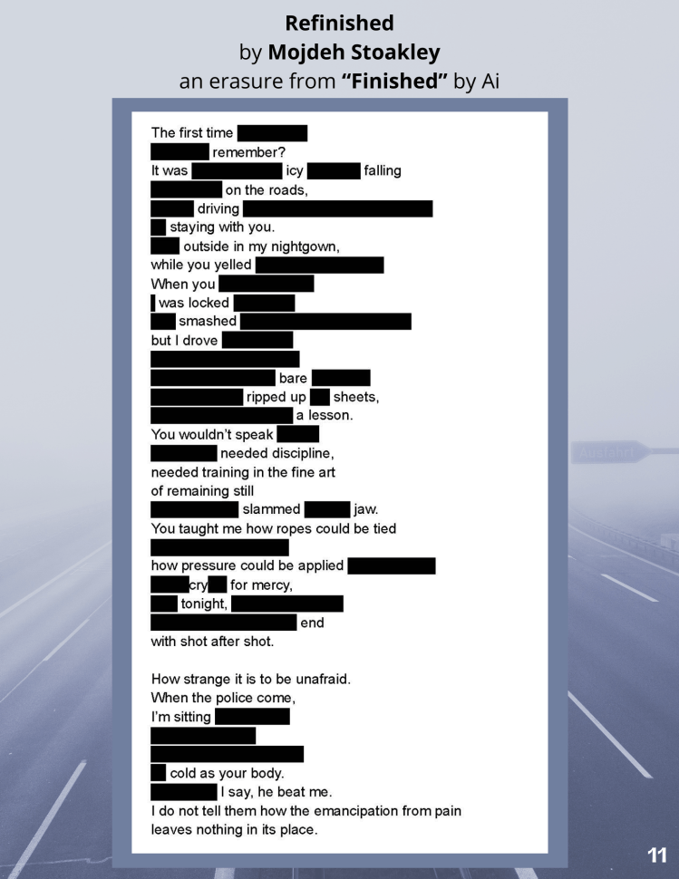 Image description: The background is a faded photo of a highway in grayscale, with white road markings on the lanes. The text is a white rectangle with a light gray border. The text is black with various words blocked out with black bars of varying lengths. The text is justified left. There is a page number ’11’ in white in the bottom right corner.
