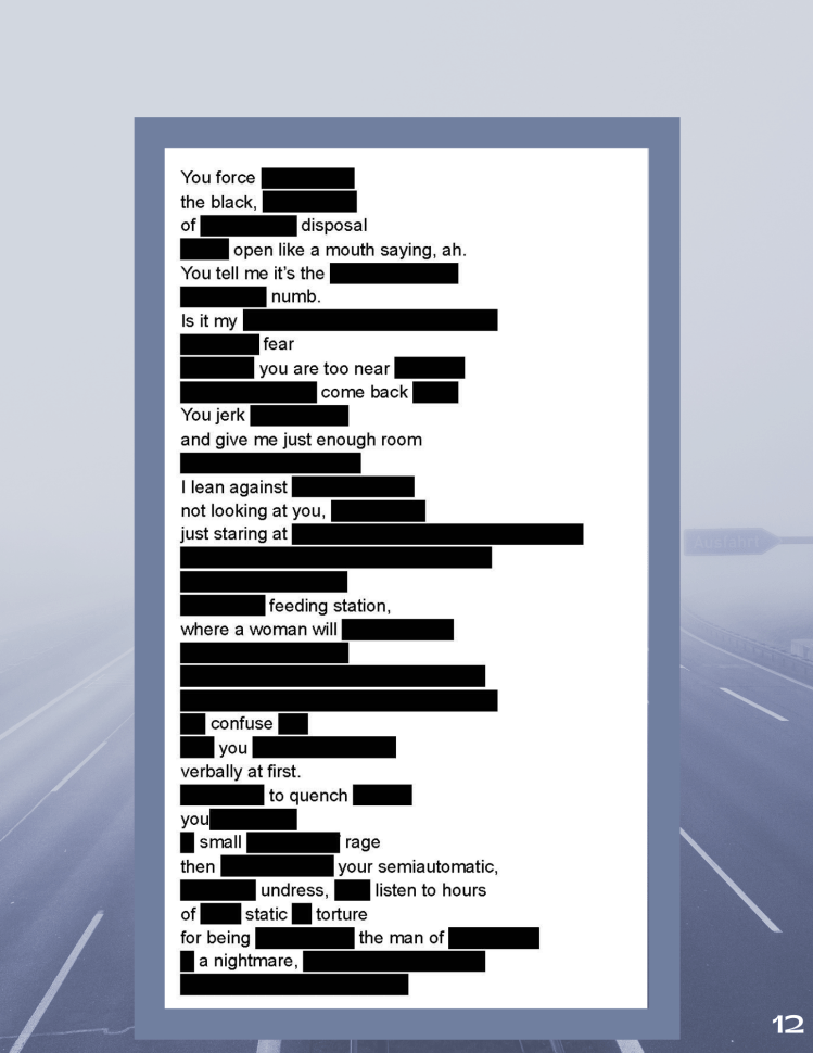 Image description: The background is a faded photo of a highway in grayscale, with white road markings on the lanes. The text is a white rectangle with a light gray border. The text is black with various words blocked out with black bars of varying lengths. The text is justified left. There is a page number ’12’ in white in the bottom right corner.