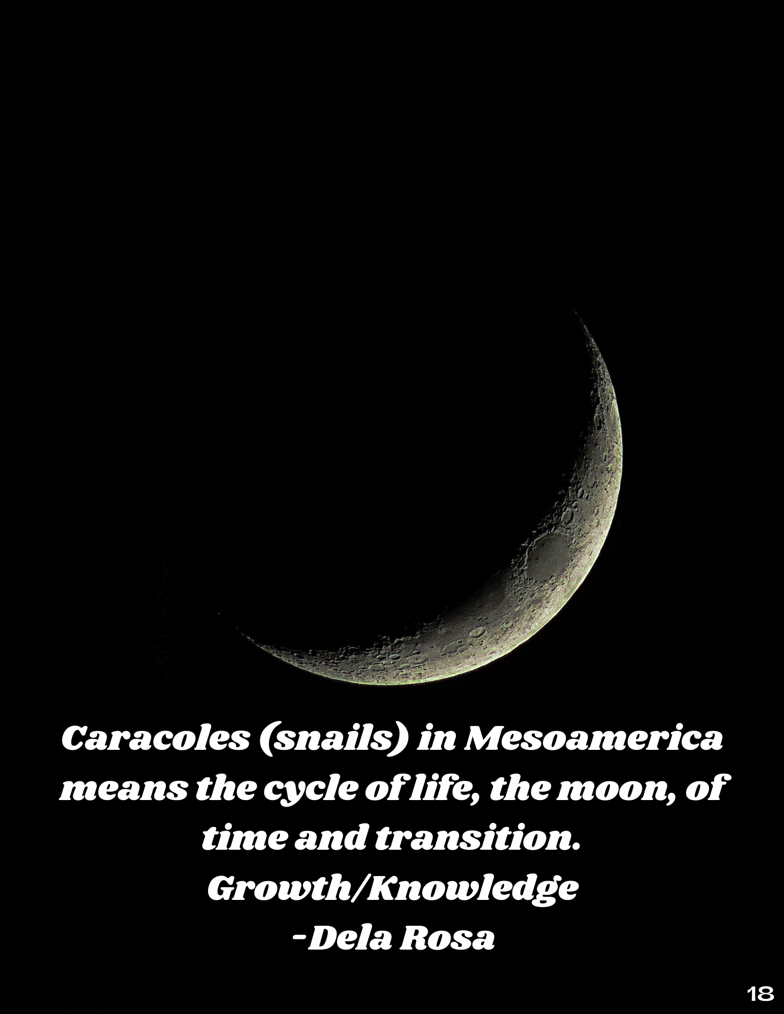Image description: A light gray crescent moon with visible craters is in the middle of a black page. The text below the moon is in bold white font and is centered. There is a page number ’18’ in white in the bottom right corner.