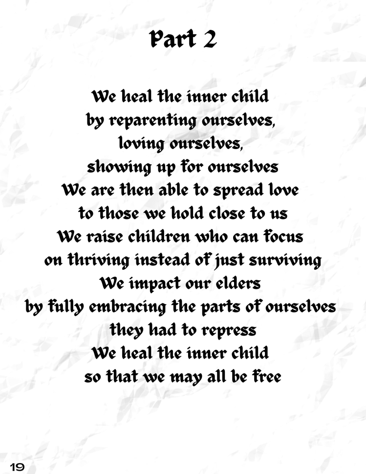 Image description: a black and white drawing of femme person with their eyes closed, with long dark hair, hugging a ball filled with stars and a child inside. Both people have smiles on their faces. The femme person holding the ball has a body that is curvy and naked. There are also stars in their long, dark hair. The image is against a white background with black text in the center of the bottom of the page that says “Healing Our Inner Child by CLAU” and with a black page number 20 on the bottom right of the page. The “U” in “CLAU” has an umlaut over it.