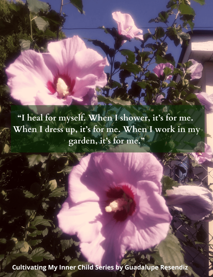 Image description: color photograph of pink hibiscus flowers and green leaves against a blue sky with sunshine making the pink hibiscus flowers very bright. There is a rectangular green box in the center of the page with white text. At the bottom of the page, there is white text over the photograph that says “Cultivating My Inner Child Series by Guadalupe Resendiz.”