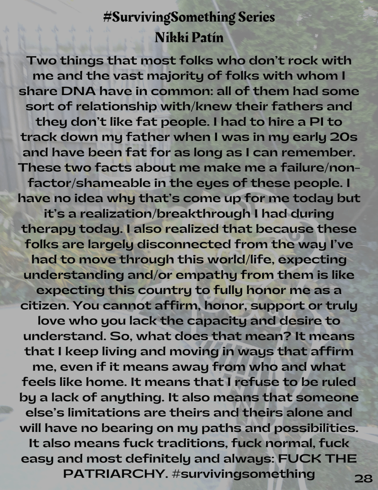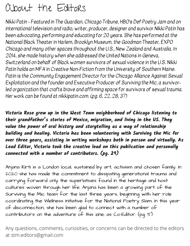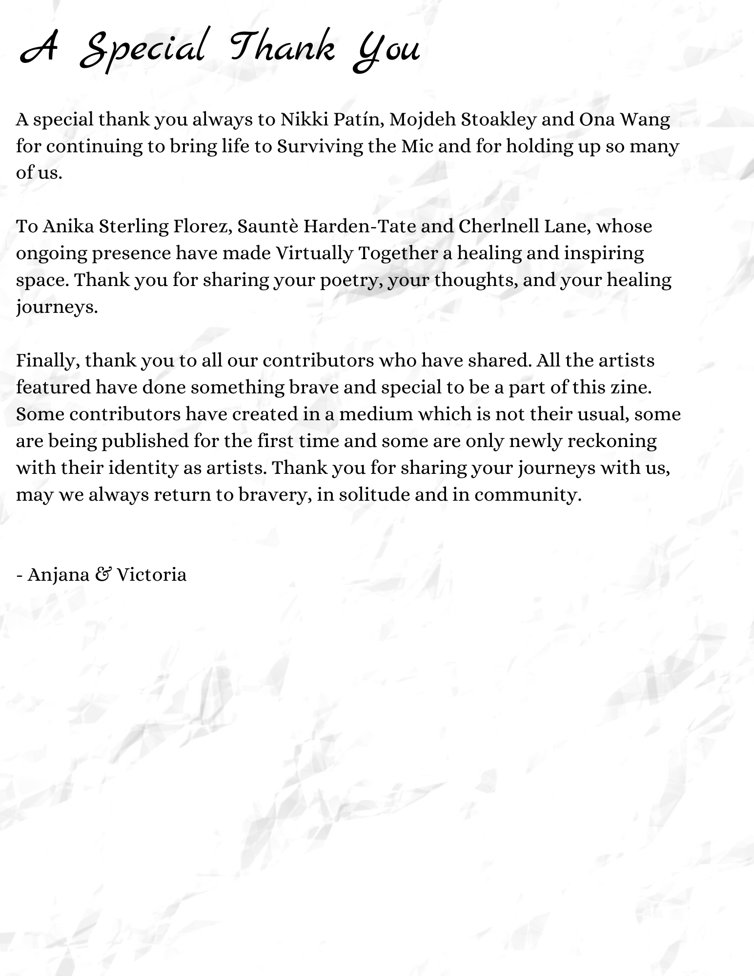 Through a generous grant from Third Wave Fund, Surviving the Mic was able to create its first digital zine. The zine was curated, designed and edited by Victoria Rose, with additional editing and design support from Anjana Kirti, Cherlnell Lane, Nikki Patin, Mojdeh Stoakley and Ona Wang.