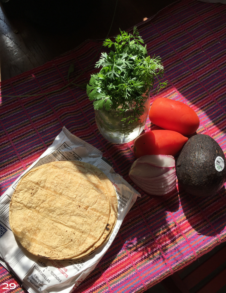 Image description: food ingredients it on a Mexican style table cloth with thin multicolor stripes woven over magenta pink fabric. The ingredients are (clockwise from top): a glass Mason jar full of fresh cilantro, two Roma tomatoes, a dark Hass avocado, a slice of red onion, and an open package of corn tortillas. The sunlight shines from the top, illuminating the glass jar and casting a shadow of the vegetables on the table.