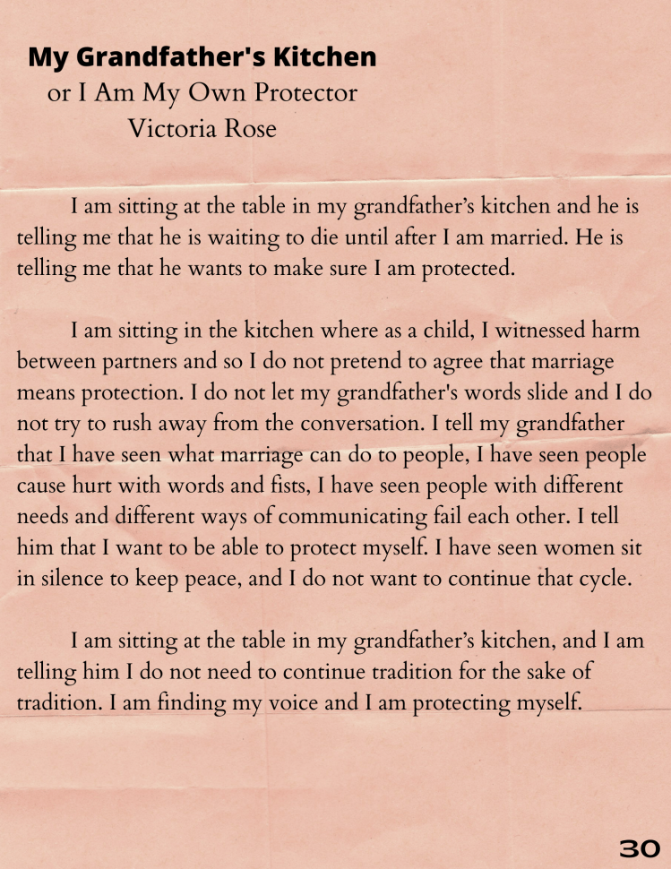 Image description: Black text is presented in paragraphs with indentation. The first title, ‘My Grandfather’s Kitchen’ is in bold at the top, justified left, with the second titles and artist below it. The background is a piece of pale peach paper with three horizonal folds, as if the paper was folded for a letter. There is a page number ’30’ in black in the bottom right corner