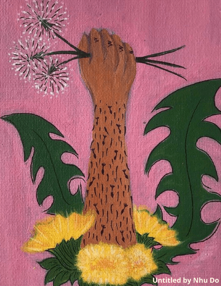 Image description: An acrylic painting with a salmon pink background depicts a hairy, brown arm emerging from a bunch of four fresh yellow dandelions with dandelion leaves. The hand is formed into a fist, holding three picked white dandelions which have gone to seed (white fluffy seeds). Some of the individual hairs on the arm resemble solitary dandelion seeds.
