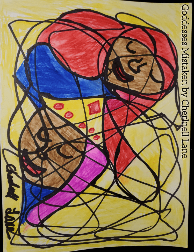 Image description: Full color hand illustration of two Black women from a set of abstract black lines and loops on a yellow background. The two women are mother and daughter, they are wearing blue and smiling with eyes peacefully closed. The mother is wearing a red scarf and the daughter has hot pink hair . The mother is placing a bejeweled crown onto the daughter’s head. The illustration is landscape and signed ‘Cherlnell Lane’ in the lower right corner, by hand. The printed title in the opposite top right corner reads, ‘Goddesses Mistaken by Cherlnell Lane’.