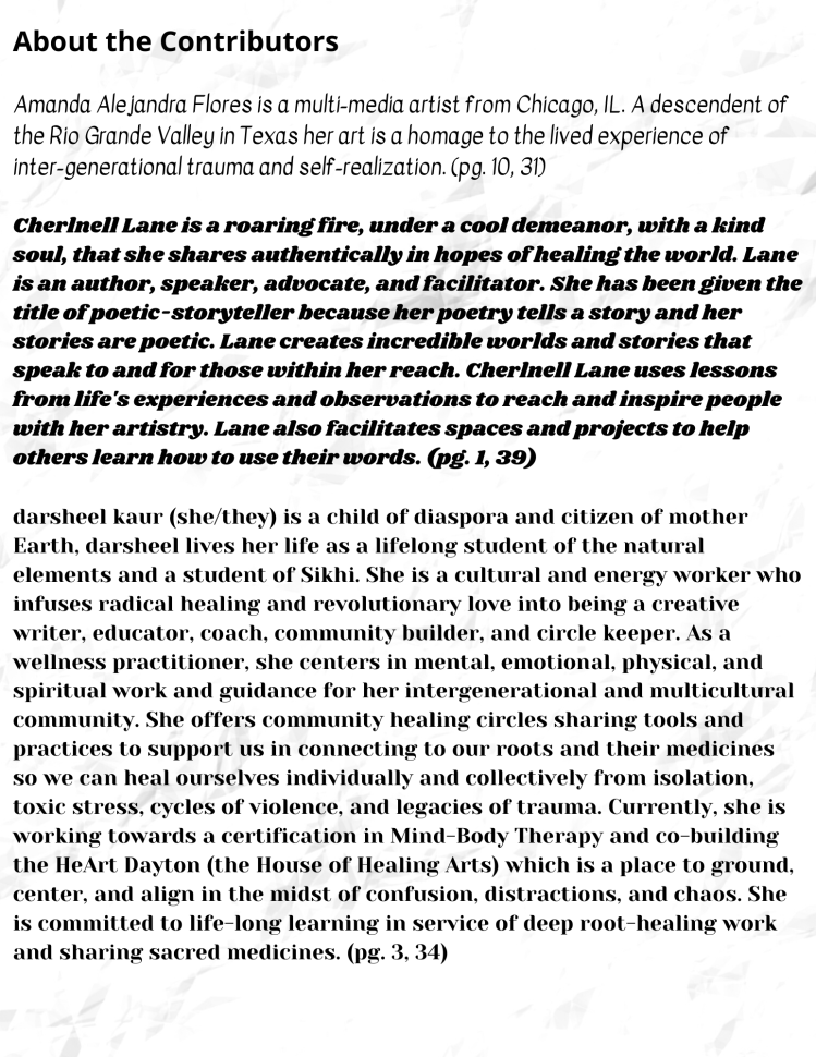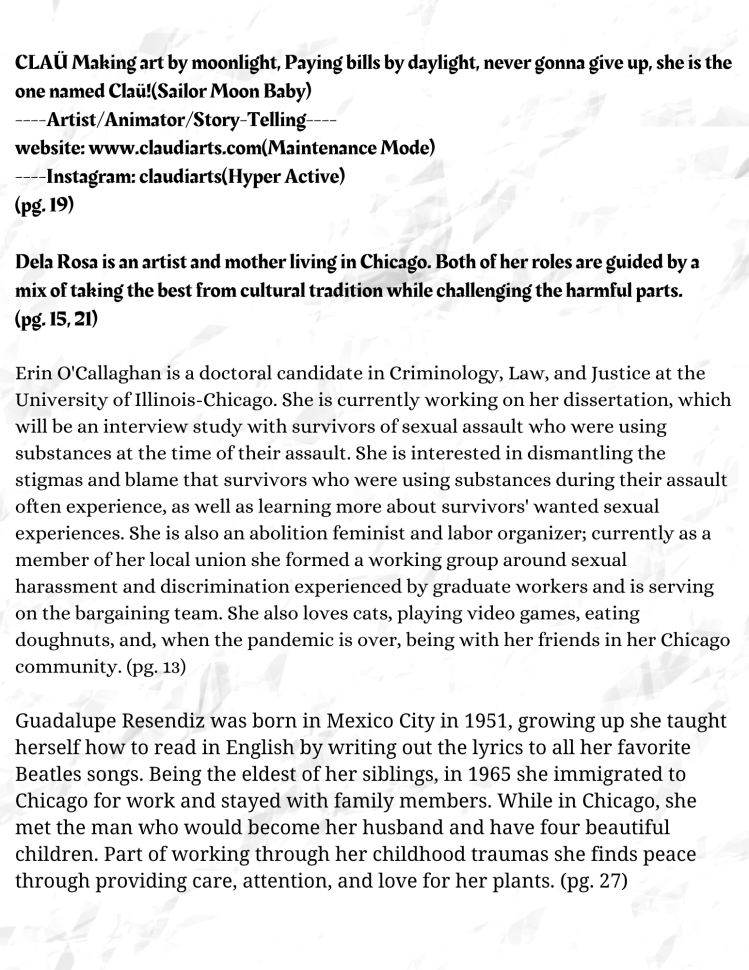 Image description: Black text with paragraphs in different fonts, one for each contributing artist. The paragraphs are centered. The background is a faded marble effect with gray marks on a white background.