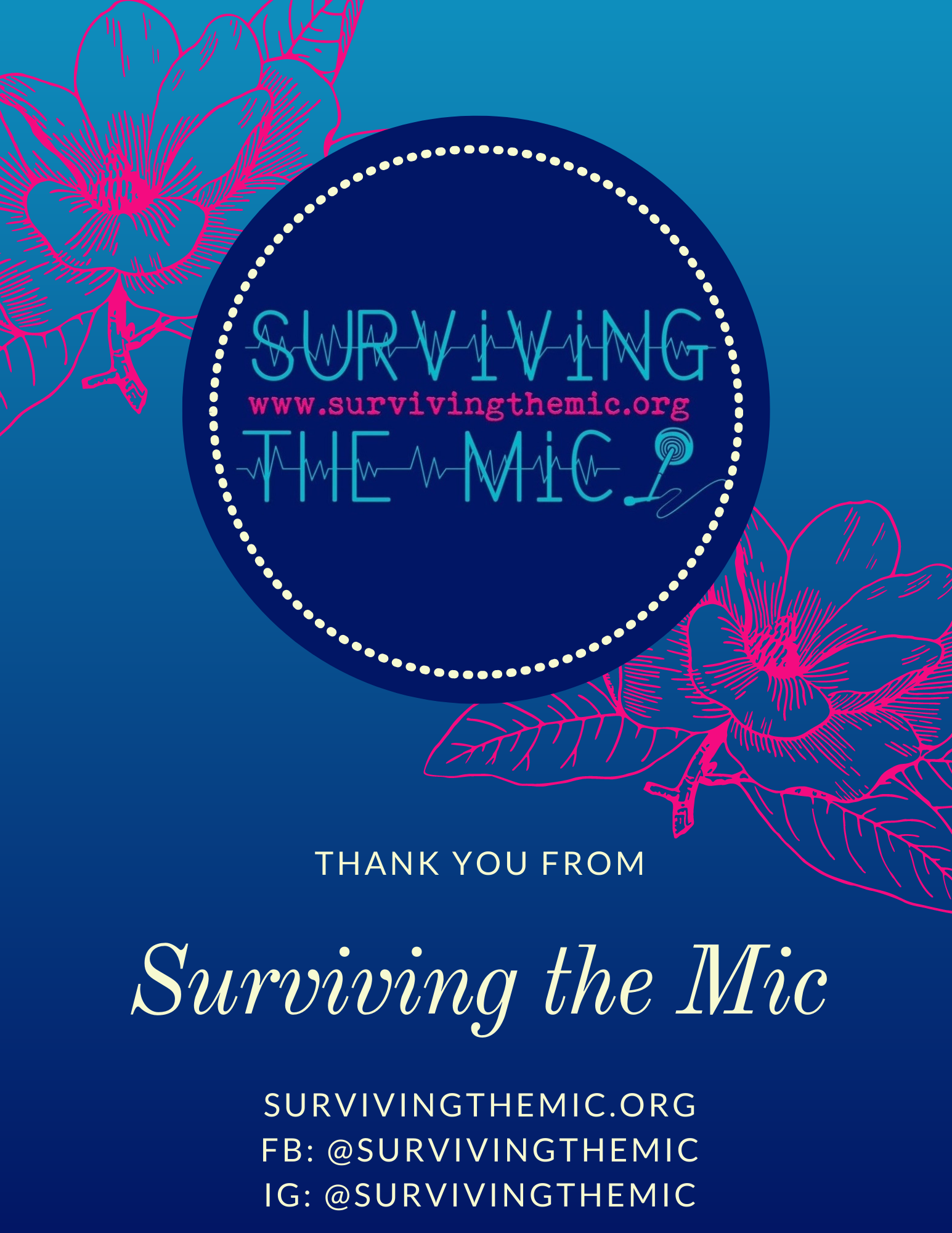 Image description: The background fades from teal to dark blue, with the round Surviving the Mic logo with a white dotted frame. The blue, teal, and pink logo depicts text and a microphone on its side. Behind the logo are two bright pink sketches of a magnolia flower with leaves.