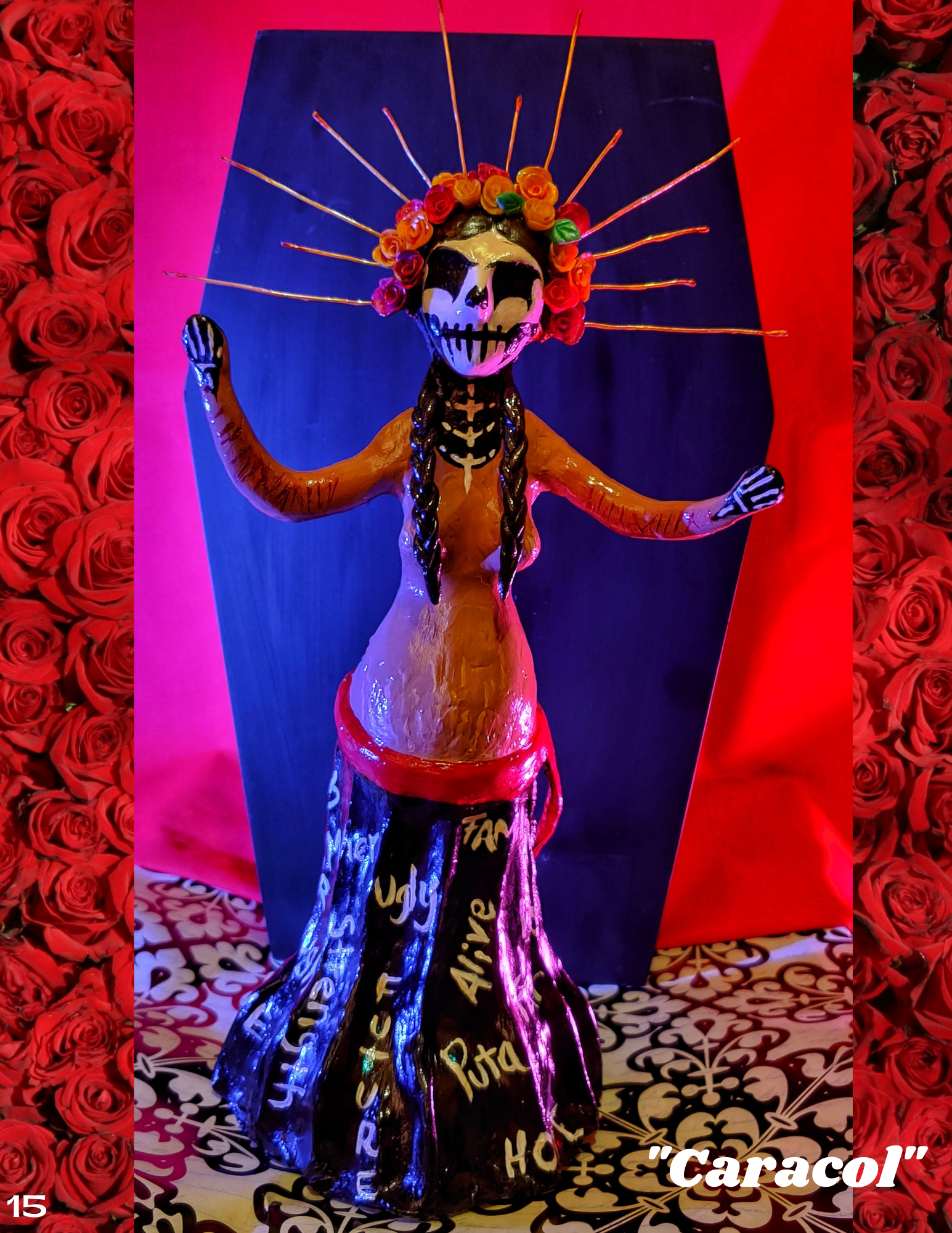 Image description: borders of red roses on either side of an image of a Catrina skeleton doll with a multi-colored crown of roses. The doll is standing shirtless with brown skin exposed, she has scars on her forearms, three rows of bones are visible by the neck and she has two braids. The doll is also wearing a long black skirt with the words “puta,” “alive,” “future,” “ugly,” “strength” and a few other words that are not readable, all in white lettering. The doll is standing on a white and black rug with a fleur de lis pattern and standing in front of an upright black coffin against a hot pink wall.